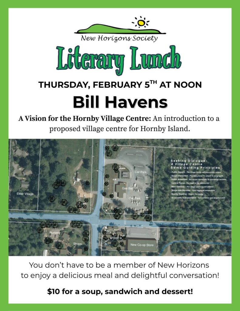 This week at Literary Lunch, Bill Havens will be joining us to present an introduction to a proposed village centre for Hornby Island. Bill will dive into questions like ‘what is the vision?’ and ‘who are the Village Centre committee of HIRRA?’. The presentation is sure to be inspiring and illuminating!
