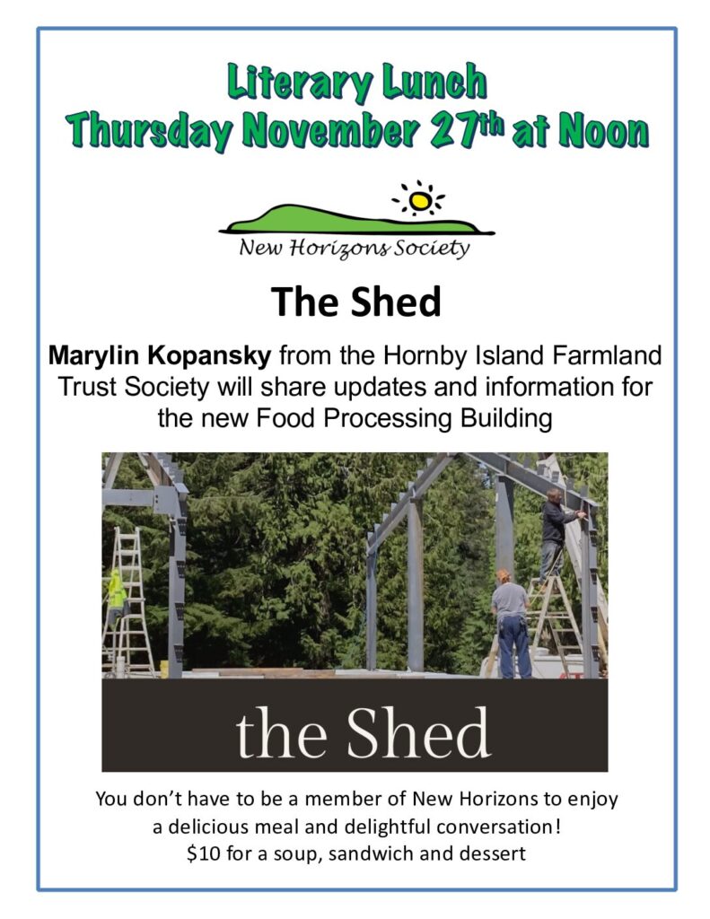 Come out to Literary Lunch on Thursday and learn all about The Shed at the Hornby Island Farmland Trust Society… and enjoy a delicious lunch, of course! All are welcome!