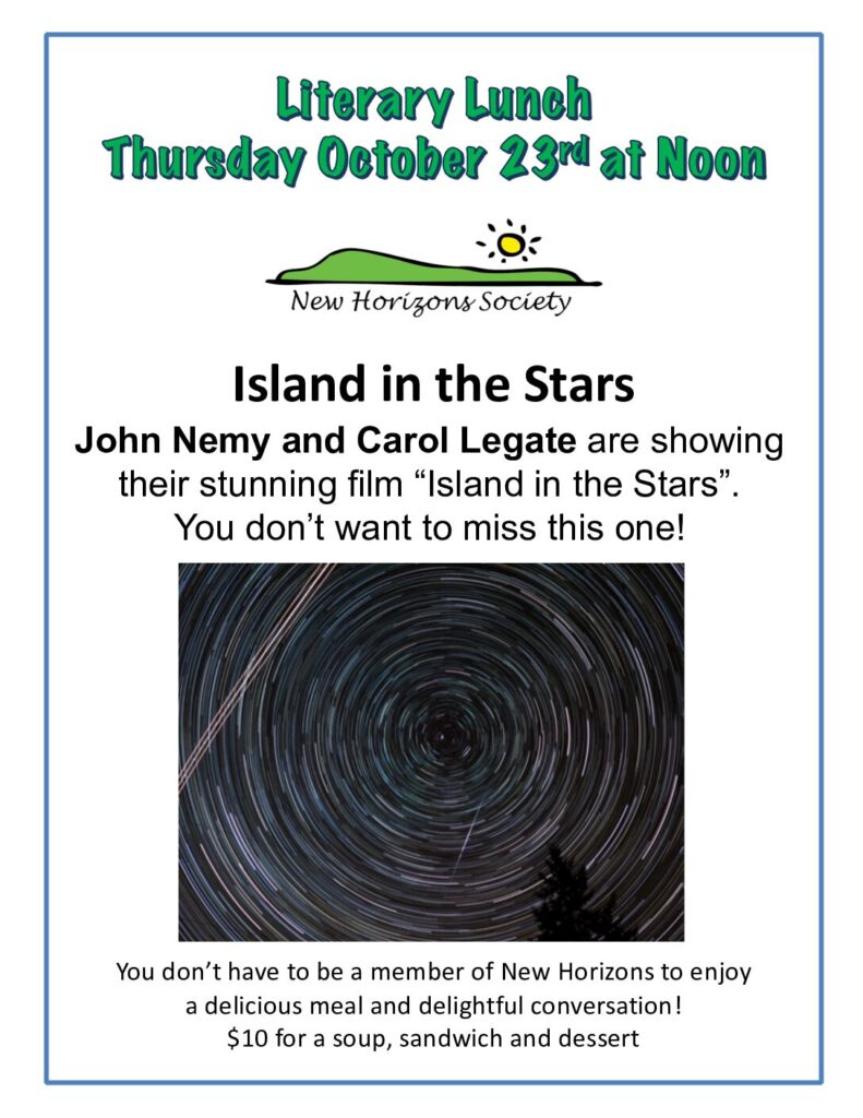 Everyone is welcome to enjoy a delicious lunch and an “out of this world” film at Thursday’s Literary Lunch! If you are able to donate your kitchen skills by making a soup or dessert at any upcoming lunch event, please get in touch with Diana King at dianaking1645@gmail.com!