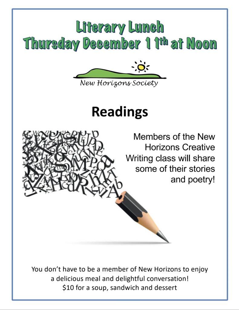 New Horizon’s Creative Writing class will be sharing some of their stories and poetry at our weekly lunch! Come out to celebrate the class’s creations.