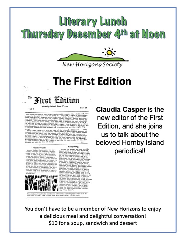 This week at Literary Lunch, First Edition’s new editor Claudia Casper joins us at New Horizons to talk about the beloved Hornby Island periodical.